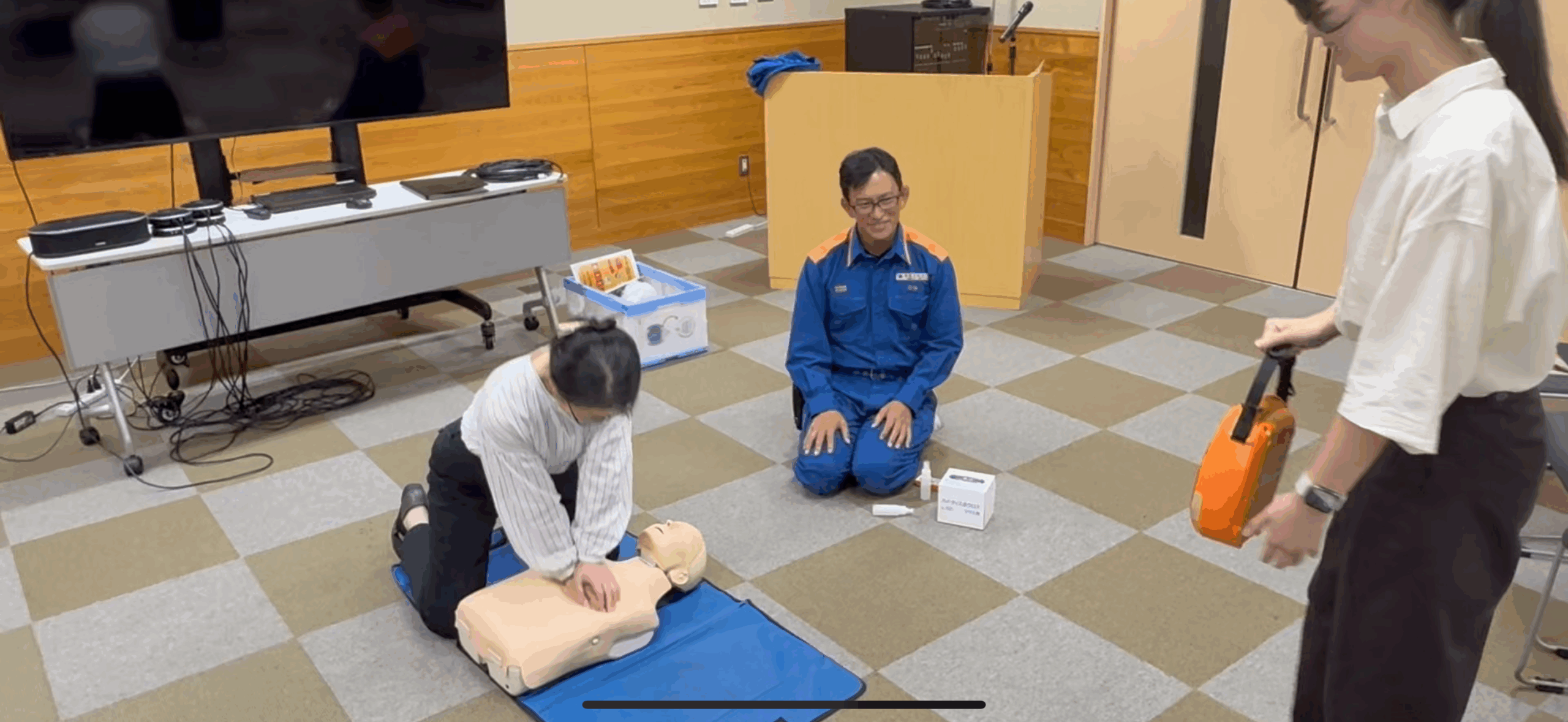 救命士の方達のお話を聞き、実際に心臓マッサージの手順やAEDの使い方を一人一人丁寧に教えて頂きました‼︎