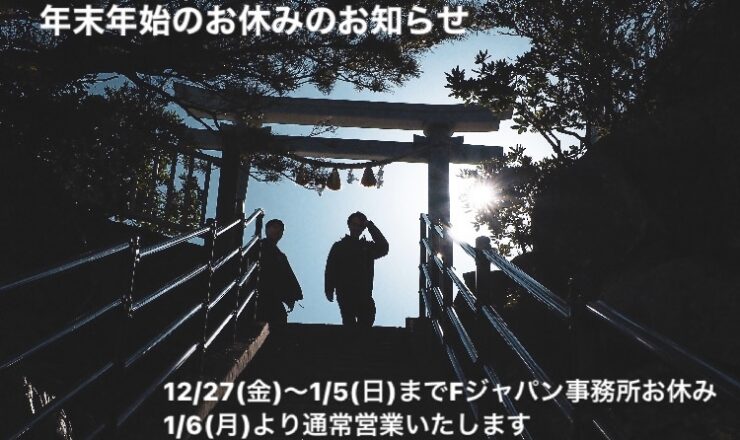 こんにちは、F・ジャパンです本日は年末年始休みのご報告です12月27日(金)よりお休みをいただき、年始は1月6日(月)からの営業となります。尚、12...